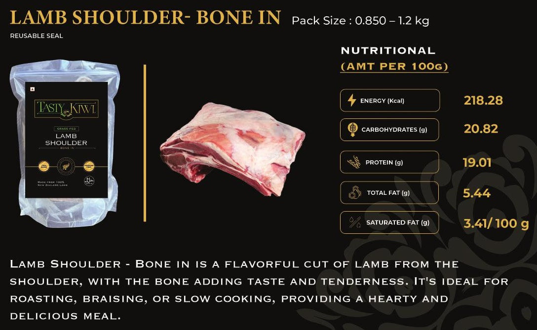 Pure South Tasty Kiwi NZ Lamb Shoulder Bone-In is a premium cut of lamb that delivers robust, hearty flavors. The bone-in shoulder retains moisture and adds depth to any dish, making it perfect for slow-cooking or roasting. This lamb shoulder is sourced from New Zealand's pristine pastures, where lambs are naturally raised, resulting in tender meat with a superior taste. Whether you are roasting for a family meal or preparing a slow-cooked lamb stew, this cut offers versatility and flavor in every bite. Ideal for creating mouthwatering lamb dishes with minimal effort, it ensures an authentic taste of New Zealand lamb.